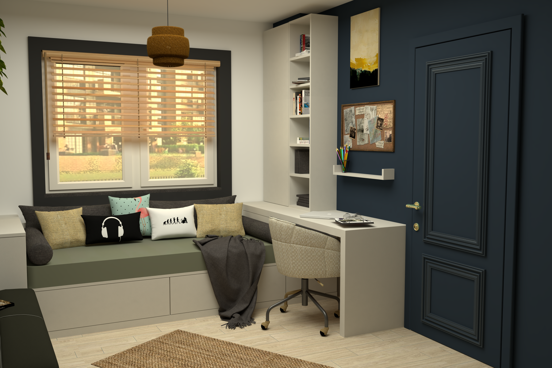 Cocuk odasi icin duzenli, ferah ve kullanim odakli mobilya yerlesimini yansitan gorsel. Renk kurgusu ve yerlesim dengesi bu alt bolumde anlatilabilir.